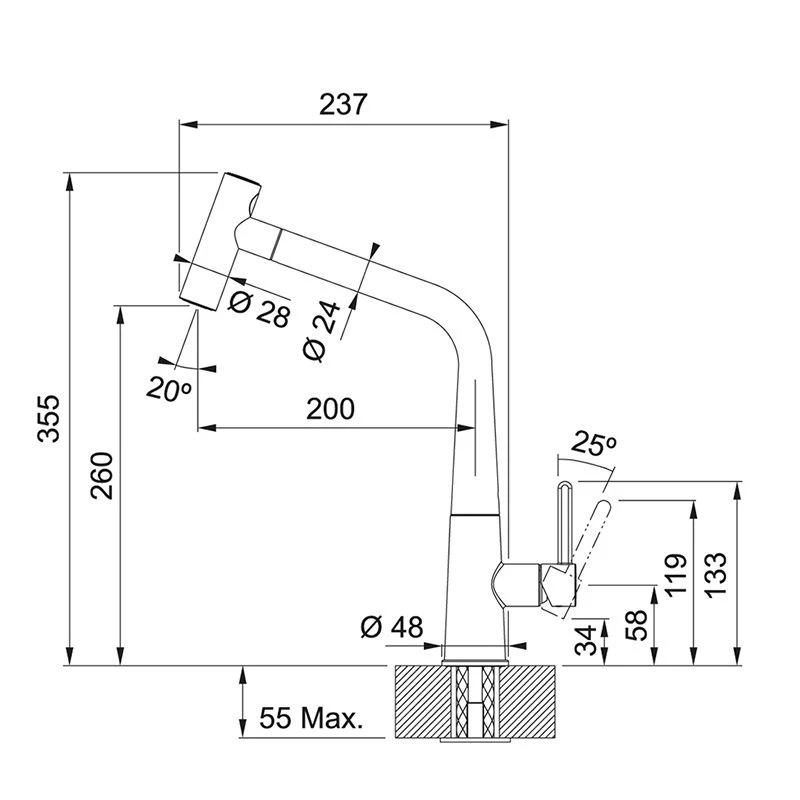 - Spout reach: 200mm